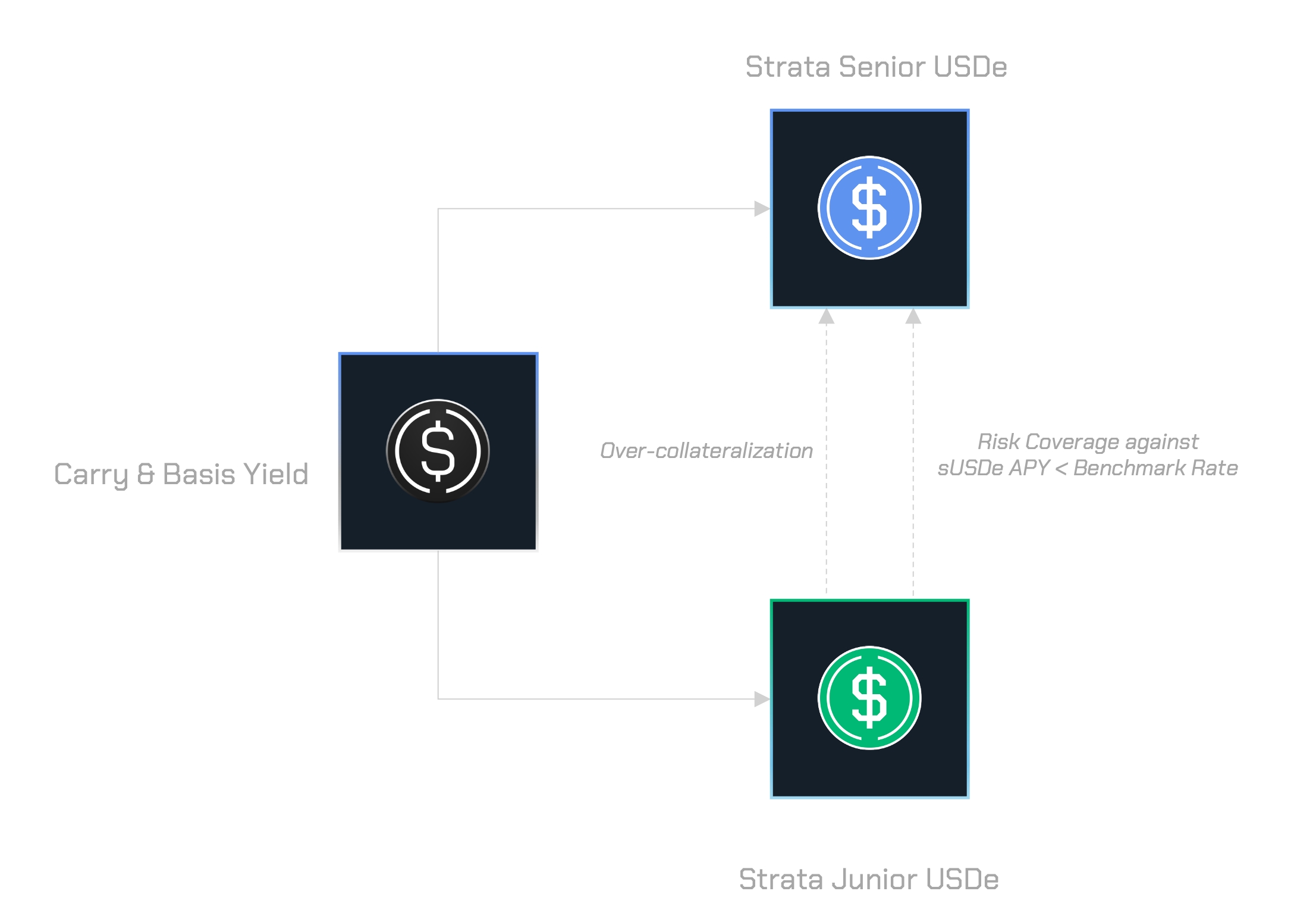 Junior USDe (jrUSDe) is a yield-bearing investment product that represents the junior risk tranche in Strata’s structure. It provides leveraged upside to sUSDe APY while simultaneously functioning as a liquid insurance pool for srUSDe. By absorbing excess risk and volatility associated with sUSDe APY, jrUSDe earns a risk premium from the senior tranche, delivering potentially higher yields for risk-tolerant investors.