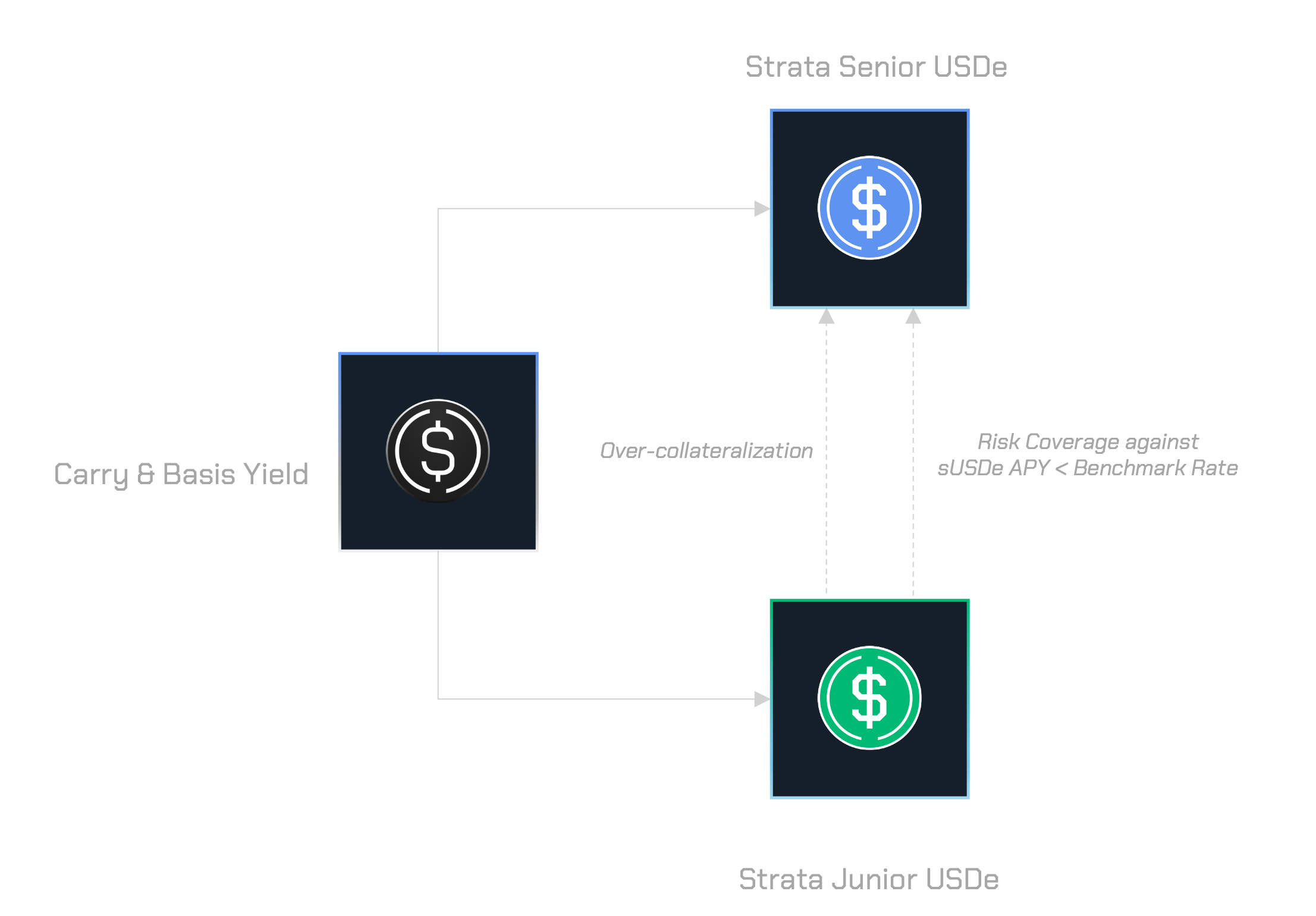 Junior USDe (jrUSDe) is a yield-bearing investment product that represents the junior risk tranche in Strata’s structure. It provides leveraged upside to sUSDe APY while simultaneously functioning as a liquid insurance pool for srUSDe. By absorbing excess risk and volatility associated with sUSDe APY, jrUSDe earns a risk premium from the senior tranche, delivering potentially higher yields for risk-tolerant investors.