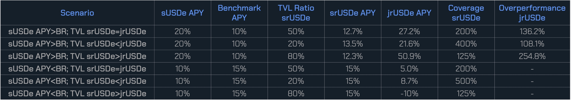 The table below shows the estimated APYs of srUSDe and jrUSDe under different sUSDe APY, benchmark rate and srUSDe TVL ratio scenarios.
